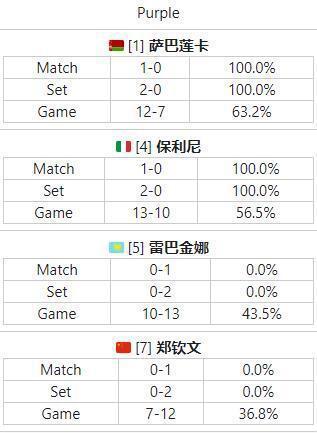 WTA 中国金花郑钦文所在的紫组在年终总决赛第一个比赛日结束了比赛。 2 比赛的竞争。郑钦文在他的总决赛中首次亮相 0-2 不敌萨巴伦卡,鲍里妮在另一场比赛中直接输了两场。 2-0 击败莱巴金娜。接着是第一个 2 对郑钦文来说,这场比赛将是一场至关重要的战斗,如果输了,很可能会提前被淘汰。