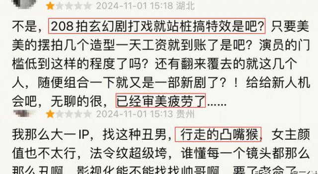 还有观众看不下“法令纹超垮的女主,凸嘴猴的男主”,还有“打戏全靠特效”的站桩。