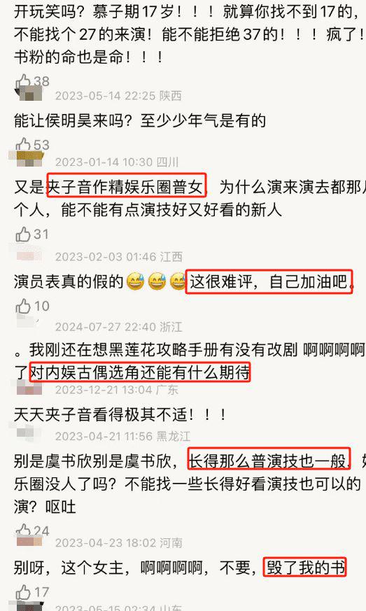 “夹子音作精娱乐圈普女”、"慕子期 17 年龄,可以拒绝吗? 37 是的,书粉的命也是命”、"对内娱古偶选人没有期望"、"看起来普通的演技也很普通。"