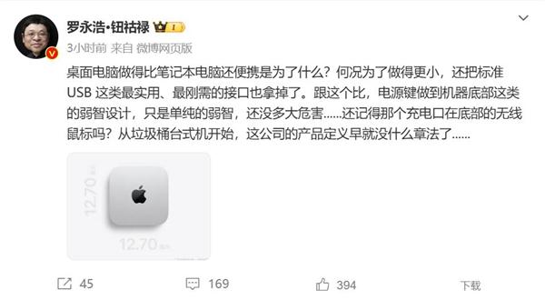 对苹果M4进行罗永浩评价 Mac mini:锁屏键做到底就是简单的智障。