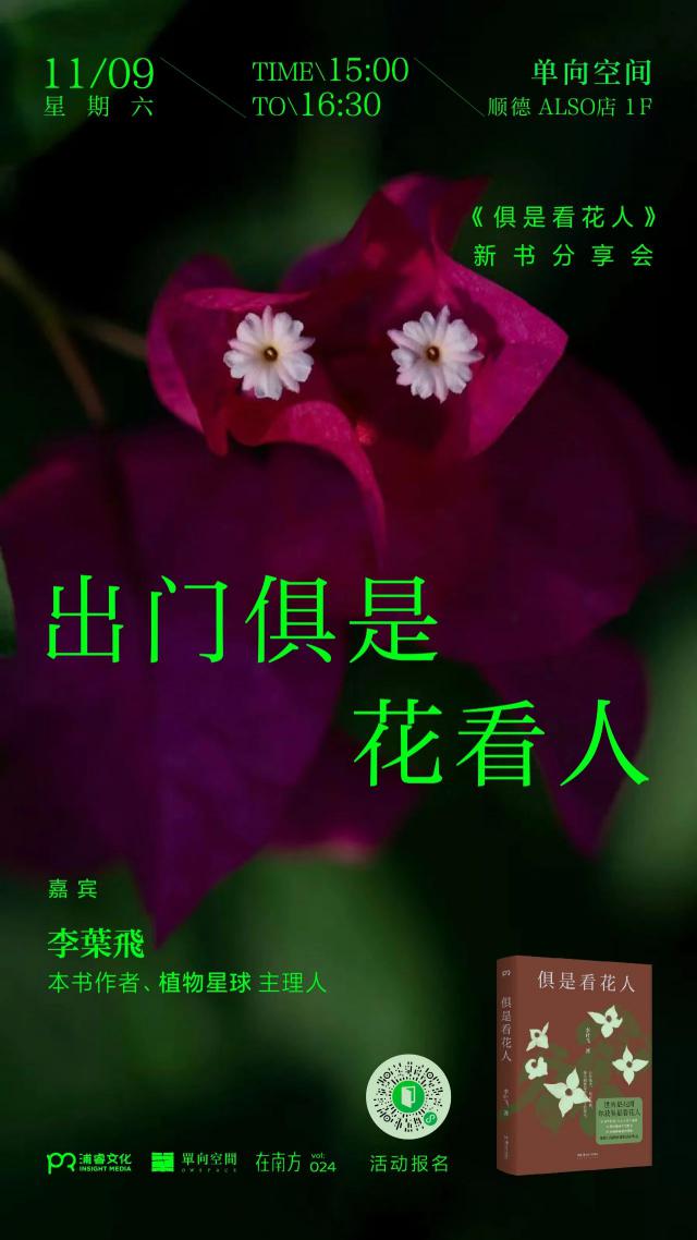 11 月 9 日(周六)15:00,美好生活微信官方账号“植物星球”博主李叶飞将携带新作“俱是看花人”来到单向空间 · 顺德 ALSO 店,从花草浪漫的佛山出发,到生机勃勃的远方,历尽与植物相伴的美好生活,重新认识我们的世界,一起感受生机勃勃的生活美学。