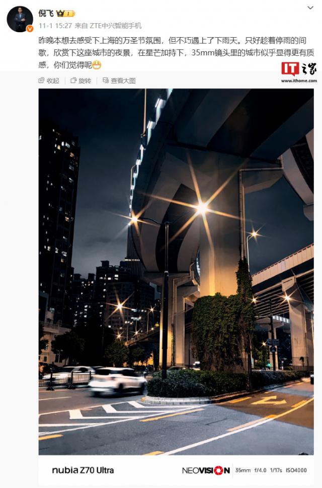 IT 世家 11 月 3 今年努比亚消息, 10 月 31 日官宣 Z70 Ultra 全屏幕手机" 11 月见”,中兴通讯终端事业部总裁、努比亚技术有限公司总裁倪飞现公布新机器拍摄样品。