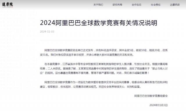 这次比赛,王某某及其指导的江苏省涟水中学相关学校教师入选决赛。,引起社会关注。两人根据决赛阅卷结果没有获奖。根据调查,王某某在预选赛中帮助了他指导的学生,违反资格赛“禁止与他人讨论”的规则。它还暴露了竞赛制度不完善、管理不严谨等问题。对于这一点,我们真诚地道歉!