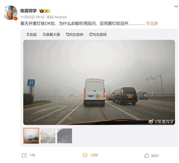 日前,汽车博主陈震发文称,雾天开雾灯就是 OK 拉,为什么都在用双闪,反而雾灯没有打开。