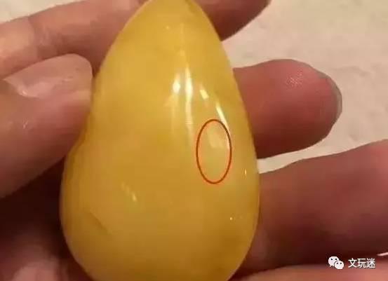 由于琥珀铂与胶质的光泽度不同,其反射光泽度也不同。仔细观察,如果发现琥珀铂上有不同光泽的小点和小块,可能是注胶。