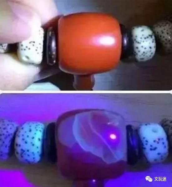 一般来说,橡胶不同于琥珀的荧光反应。在紫光下,一旦发现琥珀铂中有不同的小点和小块,可能是注胶处理的。