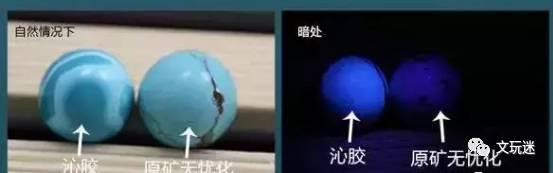 采用紫光直射,注胶绿松石无荧光反应。但是,紫光直射的方法并不能100%准确,只能作为参考。
