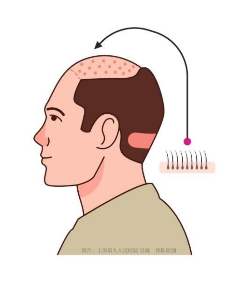 FUT:从患者后脑勺切一个头皮,然后直接缝在供应区(从患者后脑勺切一个头皮,然后把头皮分成小毛囊单位(含1-4根头发)。;