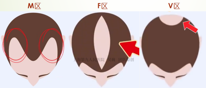 假如生发治疗不能达到理想状态,M角、头部F区域V区域均有脱发,移植面积较大,即M F 为了达到和谐自然的手术效果,V区。