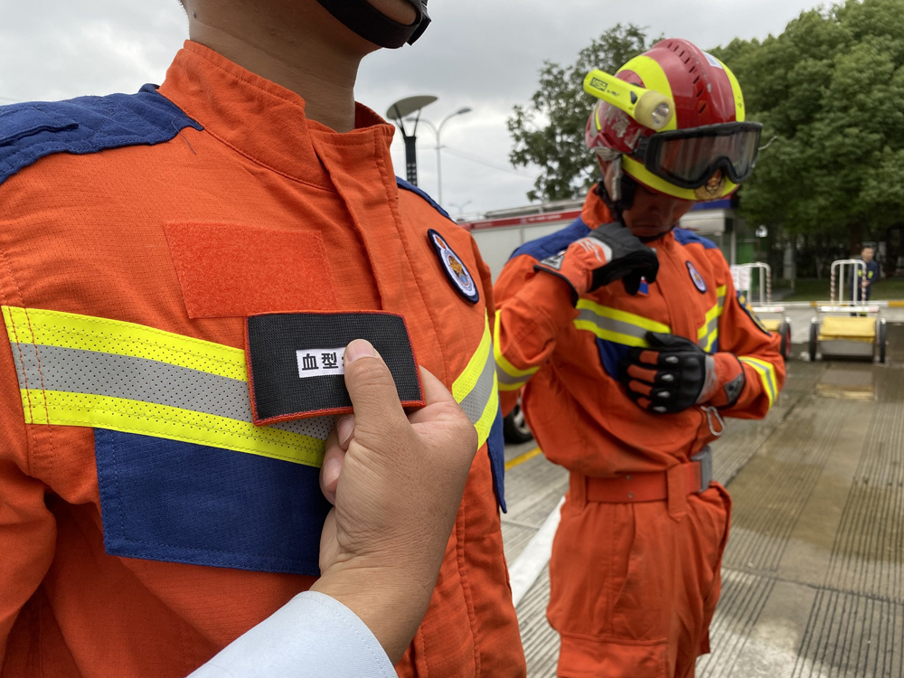新虹特勤站每个消防员的战斗服上都有一个铭牌,除了填写姓名和部门职位外,还需要填写血型。本报记者 俞凯 摄