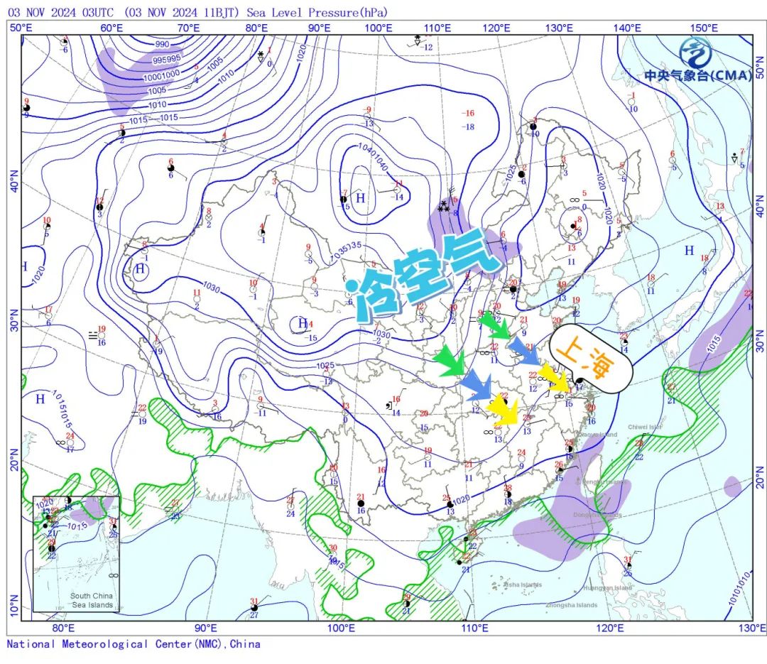 与此同时,今天(11月3日),一股强冷空气已经从北方“发货”,将影响中国中东部大部分地区从北方到南方。明天中午左右,冷空气前峰开始影响申城,风速增加,后天出现明显降温。