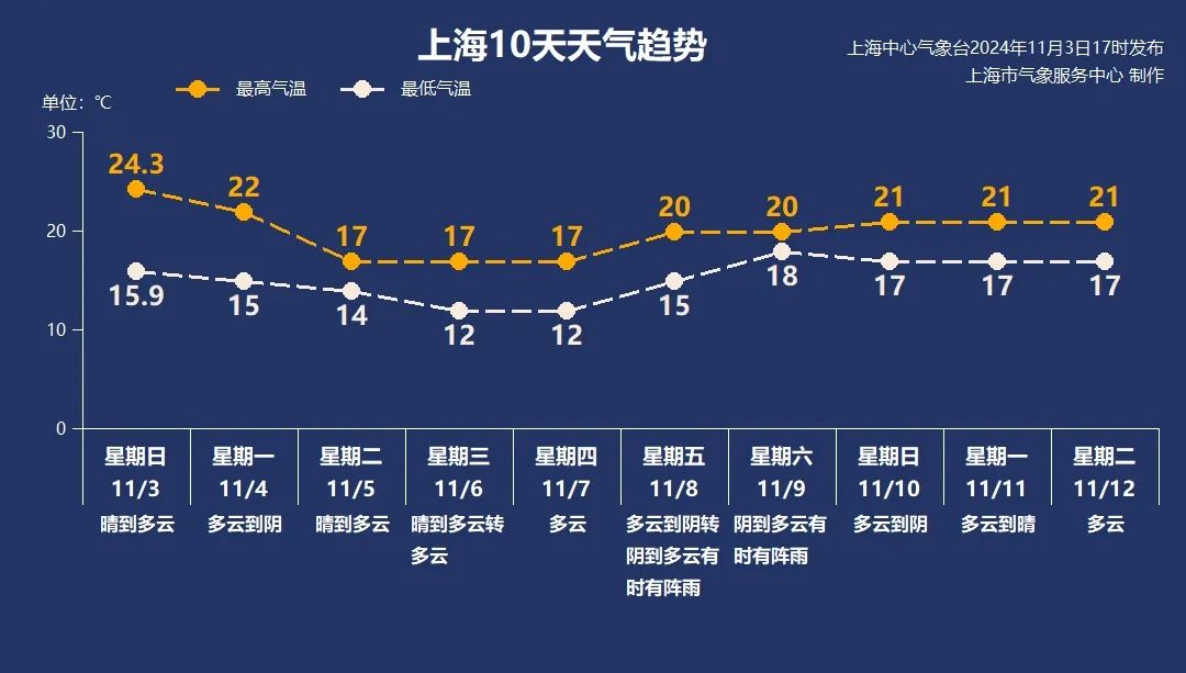 从周一到周五,上海的白天主要是晴天或多云天气。从周五晚上到周六,有一个降水过程。气温方面,在冷空气的影响下,从周二到周四,最高气温降至17℃,最低气温为12℃,部分郊区将降至个位。从周五开始,暖湿气流增加,气温升高,最高气温升至20℃,最低气温为15~18℃。