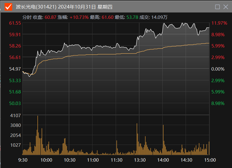 波长光电周四发布机构调查记录显示,2024年前三季度,根据公司内部收入分类,在PCB。、显示器、封测、光刻半导体和泛半导体领域的营业收入约为3000万元,超过了去年泛半导体领域的营业收入(约2800万元)。一些小型光学系统,如反射镜、聚焦镜、场景镜等光学元件,以及平行灯源系统,在应用领域都有。接近式掩膜光刻,直写光刻、包装测试,量检等。二级市场,周四波长光电收盘上涨10%以上。