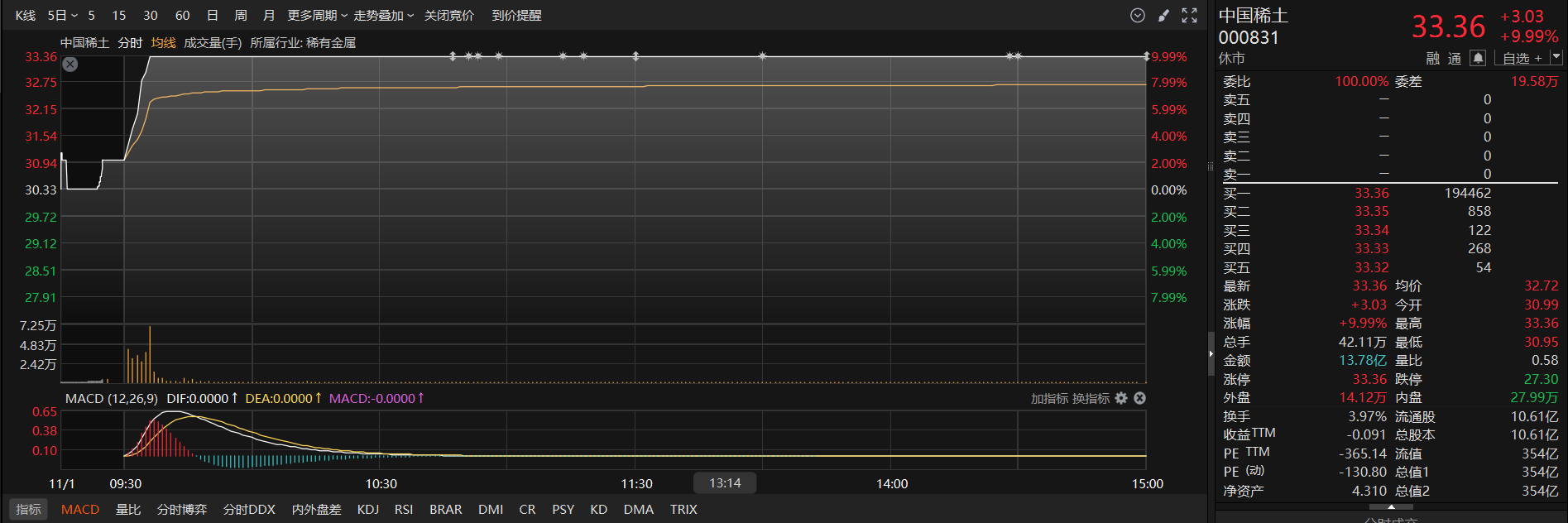 2024年,受市场环境、行业供需周期等因素影响,中国稀土周三发布机构调查记录显示,第一季度主要稀土产品价格呈快速下降趋势。,第二季度和第三季度在相对较低的水平发生波动。第四季度,部分稀土产品价格有所回升。。随着《稀土管理条例》的正式实施和供需格局的提高,主要稀土产品的价格有望回到相对合理的区间。与此同时,中国稀土集团在2023年全面完成了我国中重稀土资源整合,赣南稀土矿山改造复产取得积极成效,海外稀土资源开发取得突破,企业的资源渠道也将得到进一步的保障,现阶段原材料供应能更好地满足所属分离公司的正常生产需求。二级市场,周五,中国稀土收盘涨停。。