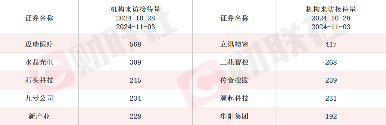 根据Choice的数据分析,具体上市公司,华威科技接受的研究次数最多,达到4次。根据机构到访接待量的统计,迈瑞医疗、立讯精密、水晶光电排名前三,机构访问接待量分别达到568家,417家309家。。