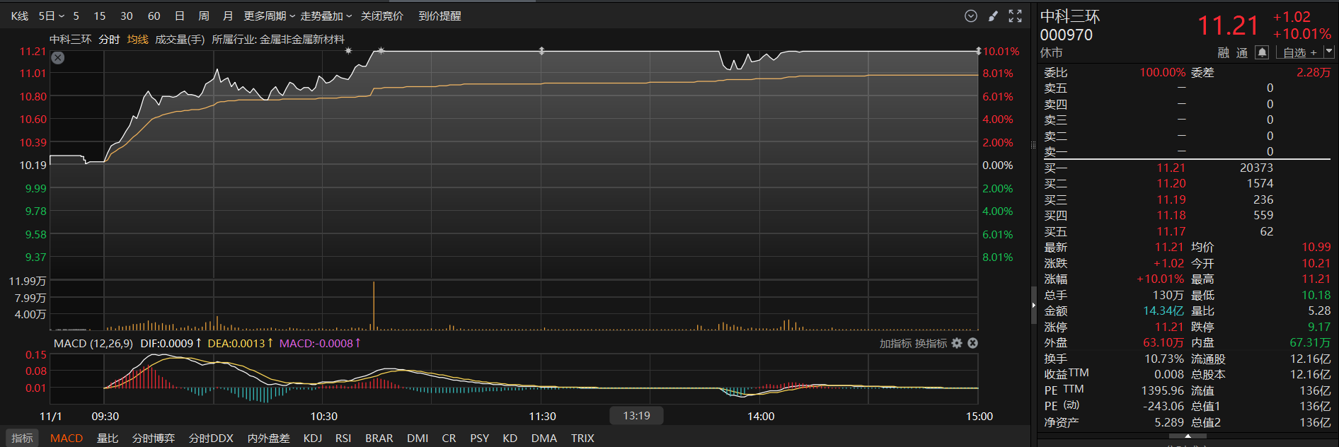 根据中科三环周二发布的调查记录,国际形势的变化可能会改变稀土原料的供应,从而影响稀土原料的价格。目前,公司稀土原料库存总量保持在2-3个月左右。,但是会根据订单和原材料价格等情况进行比较灵活的调整。二级市场,周五,中科三环收盘涨停。。