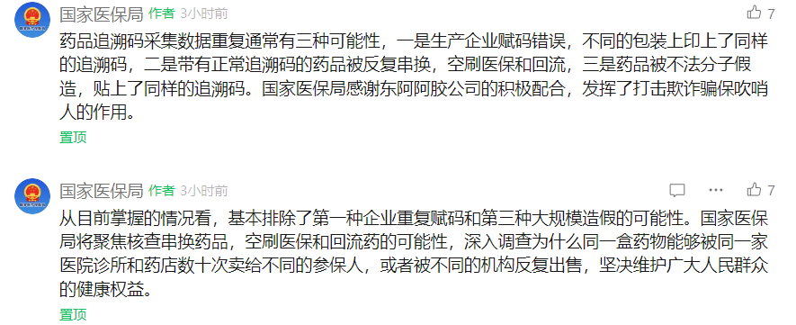 国家医保局最新回复了复方阿胶浆药品追溯码的重复情况。