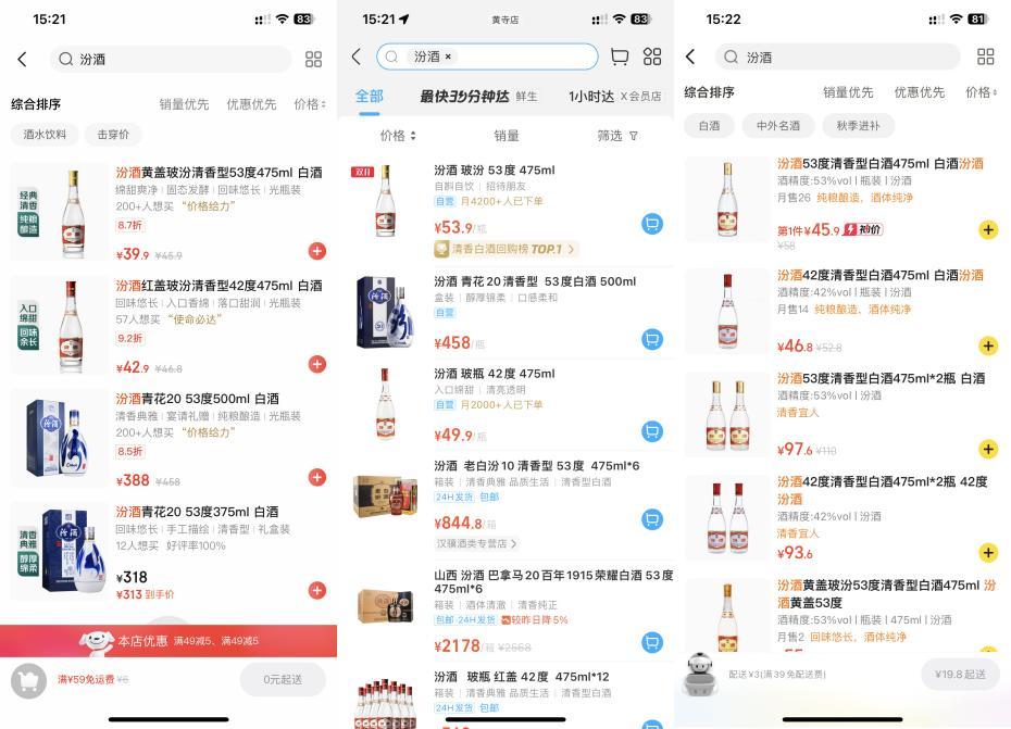 53度475ML的黄盖玻汾,京东七鲜售价39.9元,盒马售价53.9元,小象超市售价45.9元。