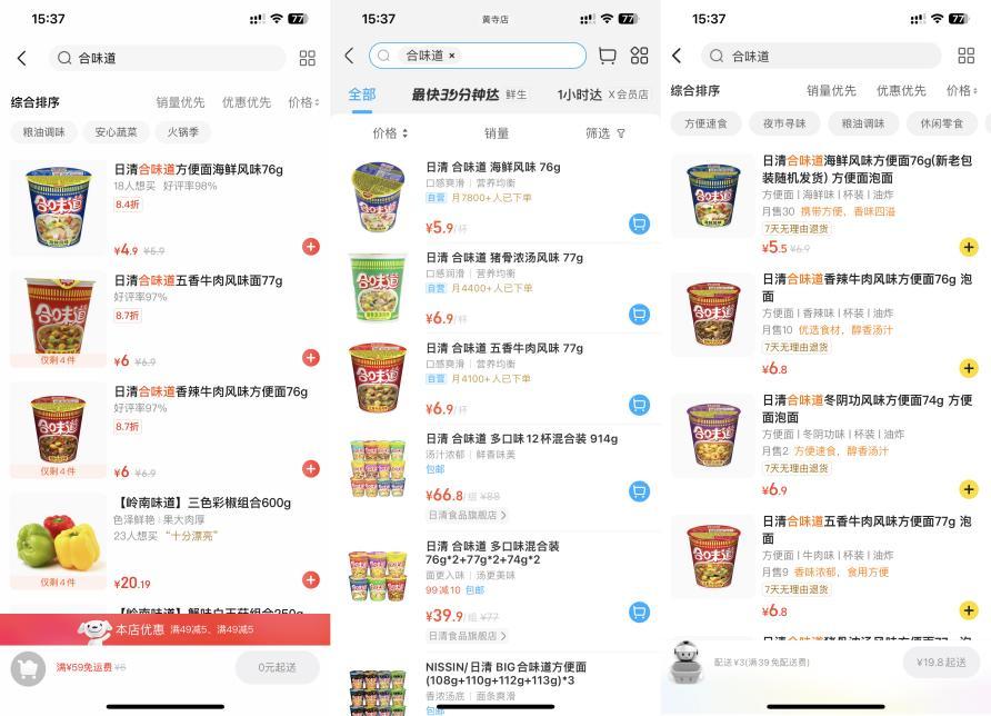76克的日清合味道方便面,京东七鲜卖4.9元,盒马5.9元,小象超市5.5元。