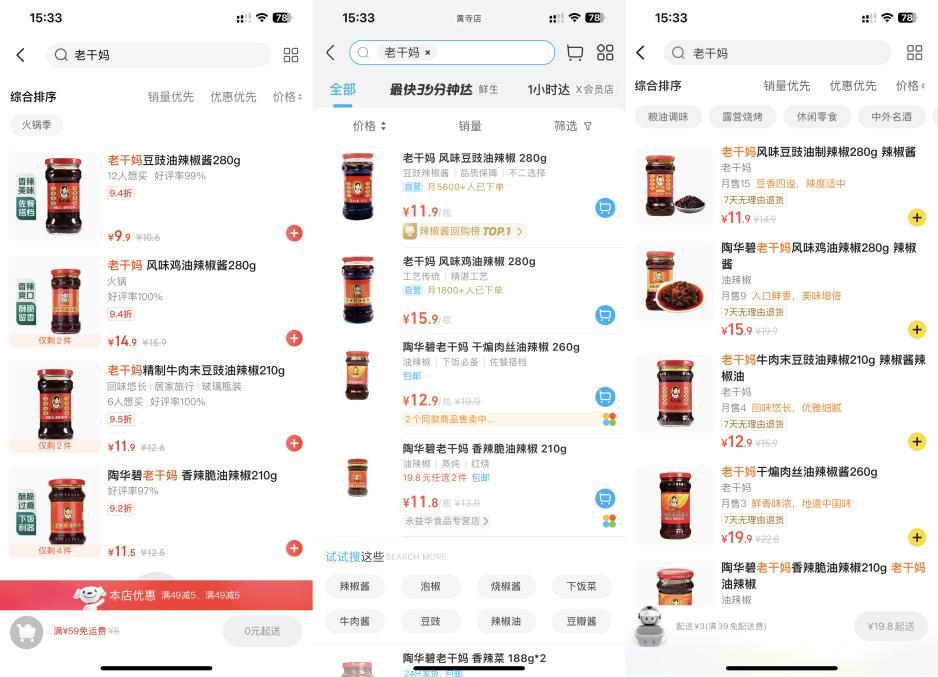 280克的老干妈豆豉油辣椒酱,京东七鲜卖9.9元,盒马11.9元,小象超市11.9元。