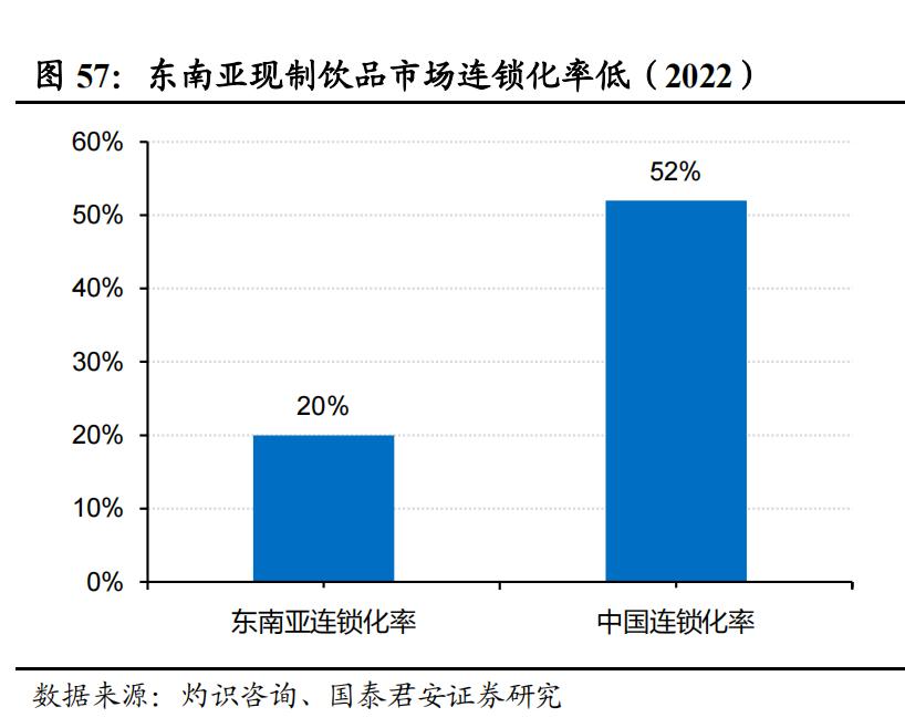 据国泰君安证券报告,相比中国市场,东南亚现制饮品市场高度分散,连锁化率相对较低,头部品牌的发展空间更为广阔。2022 年东南亚现制茶饮店市场连锁化率约 20%, 显著低于中国市场的 52%。