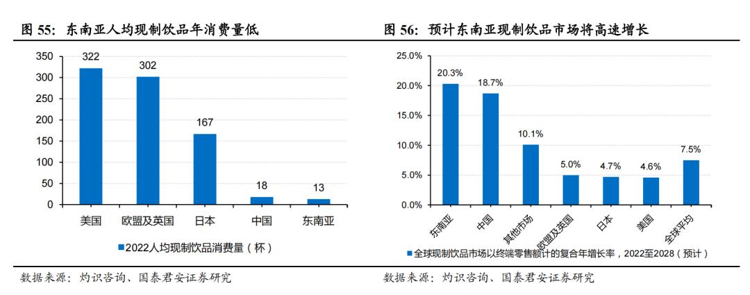 据灼识咨询和国泰君安证券研究报告,2022 年,中国和东南亚的现制饮品消费量在饮用水分摄入总量中的占比及人均现制饮品年消费量均显著低于发达市场。预计到 2028 年,中国和东南亚的人均现制饮品年消费量将分别达到 52 杯和 36 杯提升至 2022 年的近三倍水平,行业增长空间巨大。