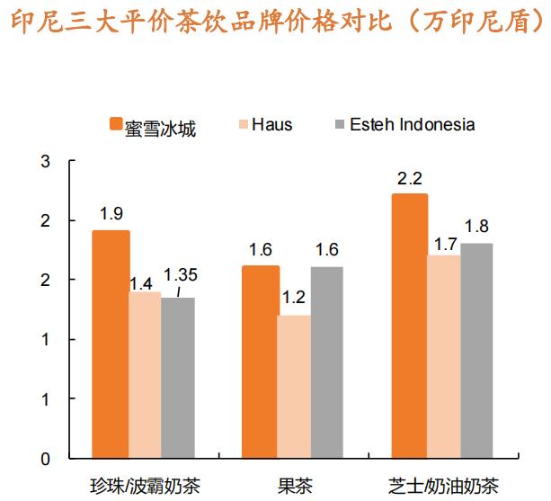 据平安证券报告,珍珠/波霸奶茶、果茶和芝士/奶油奶茶品类中,蜜雪冰城的价格均高于印尼本土茶饮品牌Haus和Esteh Indonesia。与蜜雪冰城的市场定位相似,印尼本土茶饮品牌Haus和Esteh Indonesia也都面向低端市场,蜜雪冰城的价格并不占据优势。