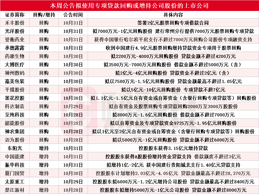 此外,许多上市公司,如誉衡药业、承德露露、东阳光、中国能建等。在此前披露回购或增持计划公告后,本周陆续披露获得信贷资金支持。。10月31日,全国最大的杏仁露生产企业承德露露宣布,公司近日收到中国建设银行出具的《贷款承诺书》,承诺为公司提供股票回购加持信贷资金4.9亿元专项用于股票回购。。在此之前,承德露露10月24日宣布将回购。用于注销3000万股至6000万股的公司股权,以减少公司注册资本。