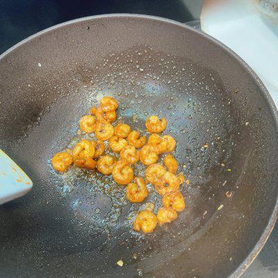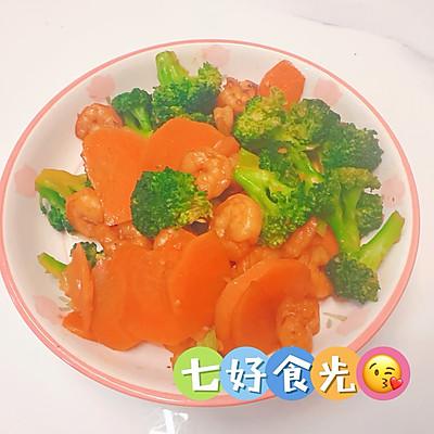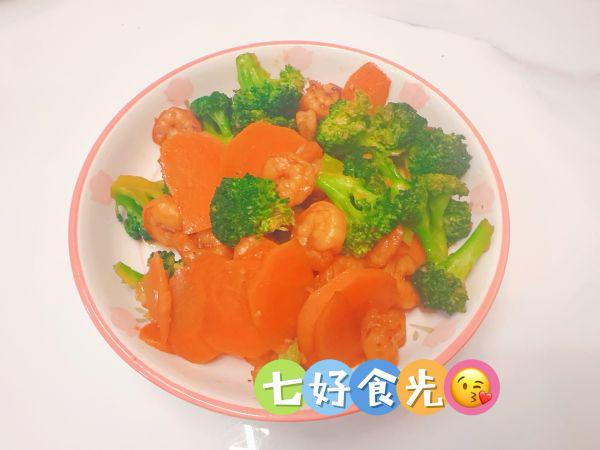 5、将蒜末倒入油锅中,倒入虾仁翻炒,倒入焯过的胡萝卜西蓝花继续翻炒,加入原味继续翻炒均匀即可。