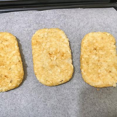 6、取出三块美国原味薯饼,放在有油纸的烤盘上。