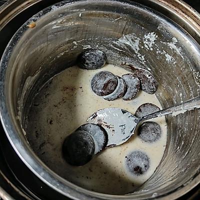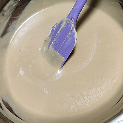 5、慕斯部分,将奶酪、糖、淡奶油、咖啡液混合均匀。吉利丁用冷水浸泡,加入 15 温水搅拌。倒入慕斯部分,隔水加热搅拌。(温度要控制,防止油水分离。因为淡奶油是用脂肪颗粒解冻的,所以要隔水加热,搅拌均匀,倒入巴斯克上方。