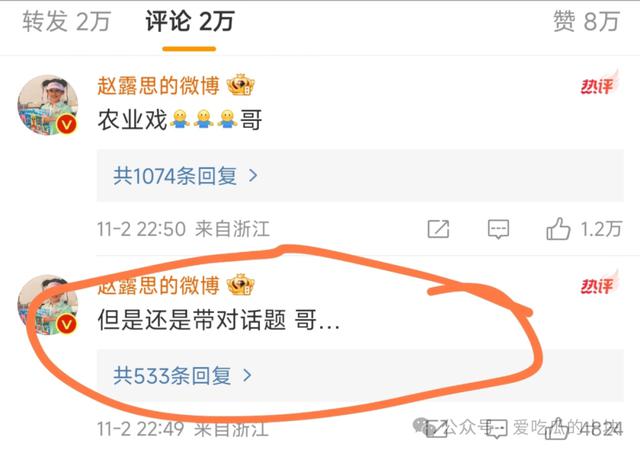 这个微博评论区,赵露思说:“但还是要带对话题。 “哥哥”,然后这条评论显示已经删除。,只剩下一开始的“农业戏” 哥"。