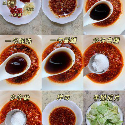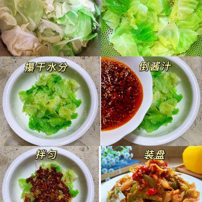2、锅里烧开水,在水里加入一勺盐和少许食用油,水开下包菜叶,焯水30秒,捞出冷水。 白菜将水分握干,放入碗中,倒入料汁拌匀即可。