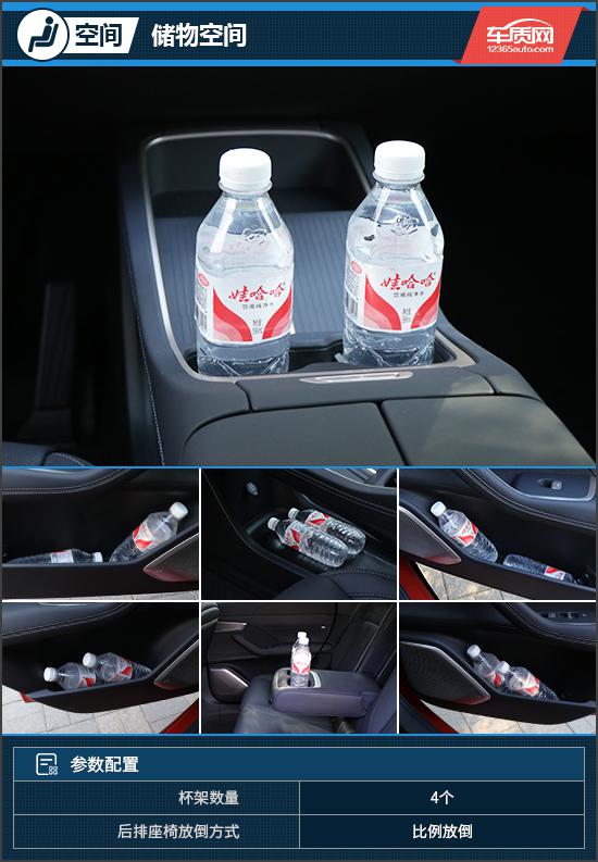 在储物空间方面,评估车配备了 4 一个杯架可以很好地满足车内乘客的需求。除了常规的储物空间外,中控台底部还进行了镂空处理,形成了更大的储物空间,不仅可以放置一些大件物品,还具有一定的私密性,非常实用。