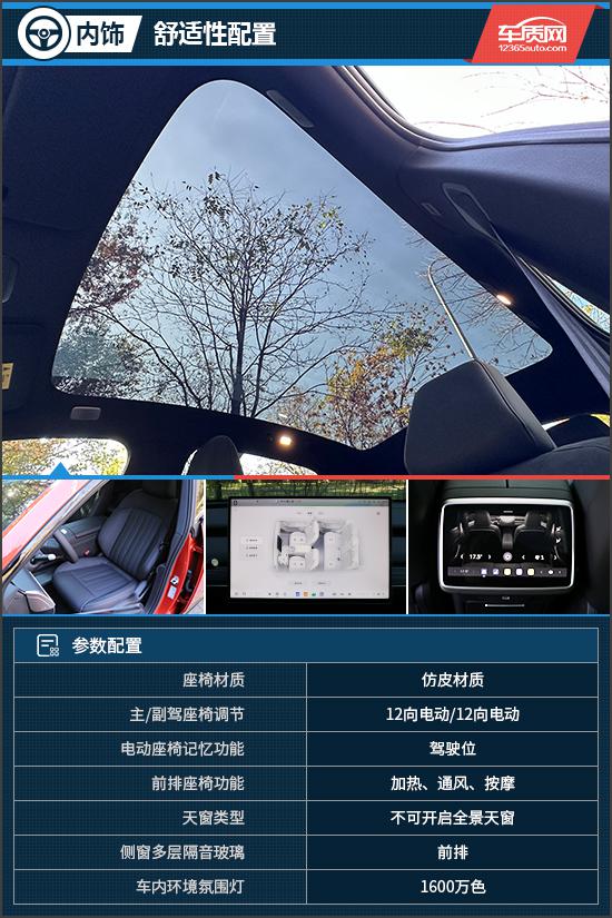 在舒适性配置方面,评估车的配置不能打开全景天窗,面积达到 1.9m ²,透光率极佳。椅子虽然是仿皮材料,但是支持多向电动调节,填充物比较柔软。此外,前排座椅具有加热、通风和按摩功能,乘坐舒适性值得肯定。