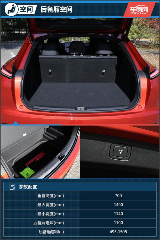 后备箱内部空间非常整洁,一般情况下容积为 495L,可放置大量物品,并且后排座椅支撑比例放下,放下后体积达到 1505L。另外,后备箱盖板下面还有一个很大的储物空间,可以轻松容纳一个。 20 英寸旅行箱,实用性极佳。