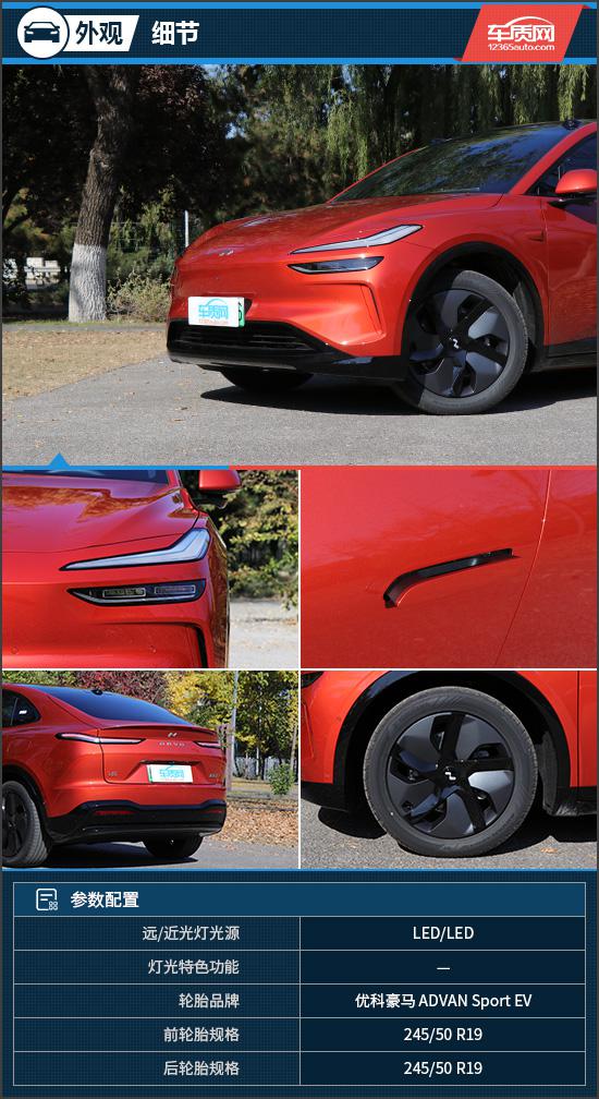 细节方面,乐道 L60 标配 LED 远 / 近光灯源,并配有自适应远近光、自动头灯、转向辅助灯等功能。目前流行的隐藏式门把手也没有缺阵,使其拥有。 0.229Cd 极低风阻。轮毂使用了 19 英尺熏黑轮毂,进一步增强了侧面的运动气氛,与之匹配的轮胎来自优科豪马。 ADVAN Sport EV 系列,是一款适用于新能源汽车的高性能轮胎,具体规格为 245/50 R19。此外,乐道 L60 还可选装 20 英尺轮毂,与之匹配的轮胎规格是 245/45 R20。