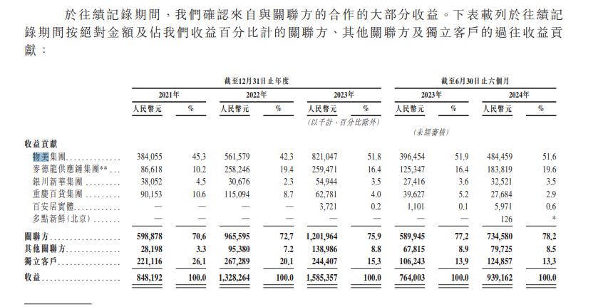 财务报告显示,2021年、2022年、2023年和截至2024年6月30日,物美关联方贡献的利润分别为5.99亿元、9.66亿元、12.01亿元和7.35亿元,分别占总收入的70.6%、72.7%、75.9%和78.2%。