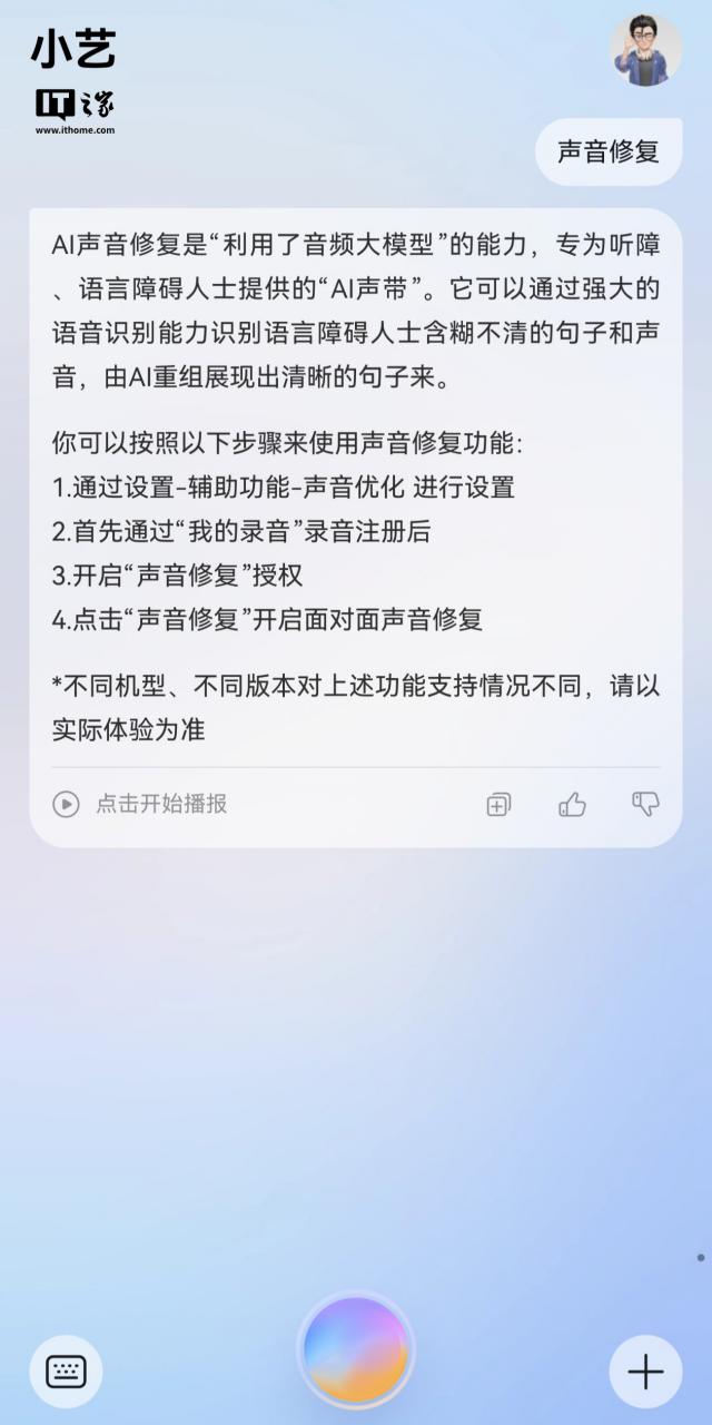 修复小艺的声音,行业首创,协助言语障碍群体交流。