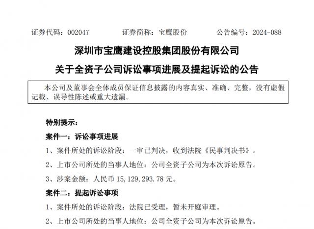 宝鹰建设近日向沈阳市沈河区人民法院提交民事起诉书。宝鹰建设已收到沈阳市沈河区人民法院出具的《诉讼费预缴通知书》,原因是建设工程合同纠纷诉讼沈阳泰盛投资有限公司和深圳荀润产业投资有限公司。案号为(2024)辽阳 0103 民初 21326 号码,宝鹰建设已于 2024 年 10 月 31 每天缴纳诉讼费,到目前为止,这个案子还没有开庭审判。