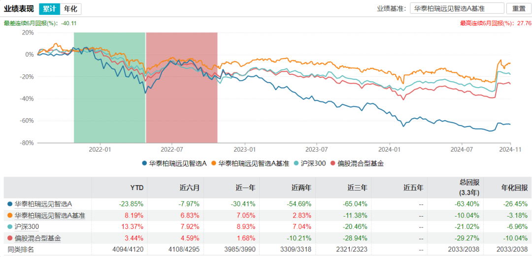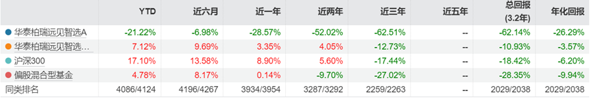 从具体数据来看,华泰柏瑞远见智选A虽然经历了一个多月的加血,但近三年净值累计下降超过54.69%,大大超过了同期业绩基准不到11.38%的下降。