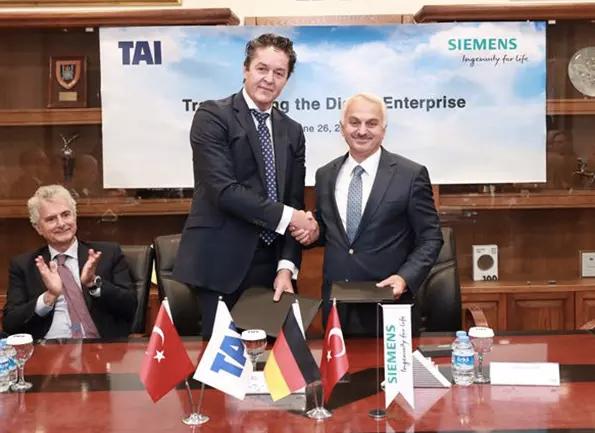 西门子PLM和土耳其航空工业公司(TAI)签约仪式上的代表握手,本次谈判达成了最大的PLM合同。