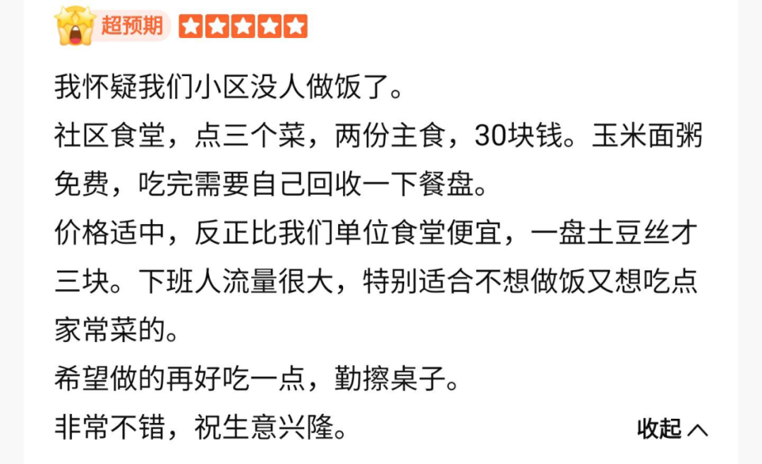 性价比高,升级的连锁餐厅不断进入,社区客户的嘴角压不住。一些消费者在评论中留言,“我怀疑我们社区没有人做饭”。