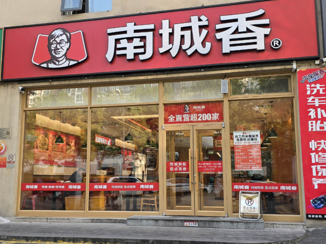 与夫妻店平面的白色背景红色招牌相比,南城香、紫光园、超意兴更大、更立体、更有设计感的门更抢眼,晚半天开灯后差别更明显。