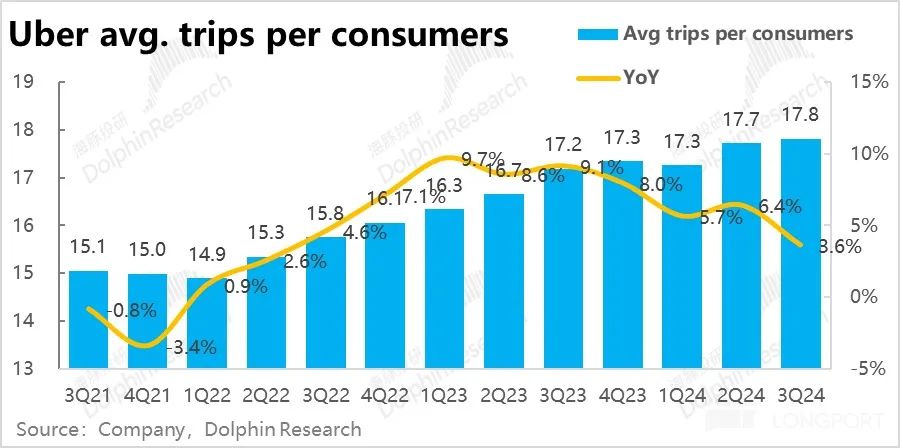 然而,也有亮点。首先,毛利实际上仍在快速增长,表现出来。 Uber 强大的议价权,即使实现率下降,也有足够的能力降低成本(骑手或商家传导),保证自己的能力。国内滴滴和美团也是如此。即使增长放缓,人均消费能力下降,平台收入也在上升。