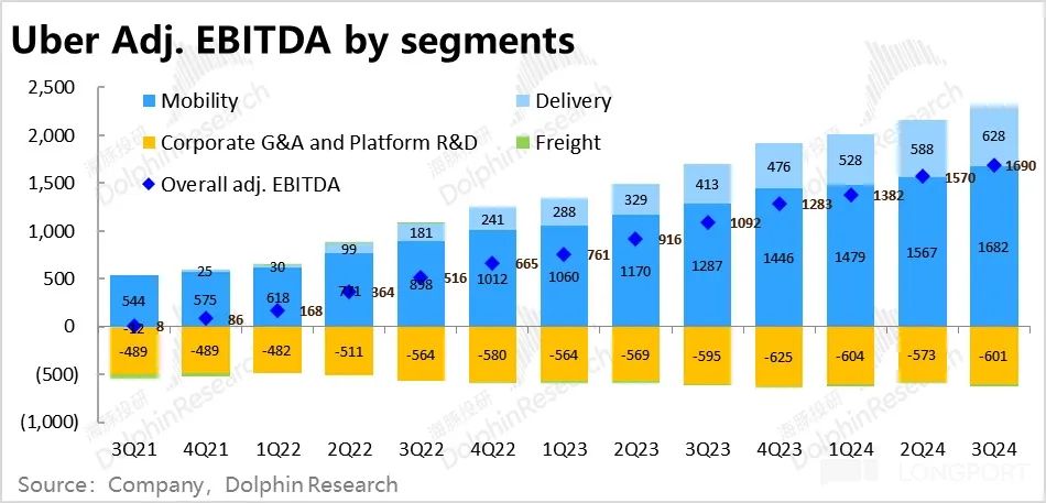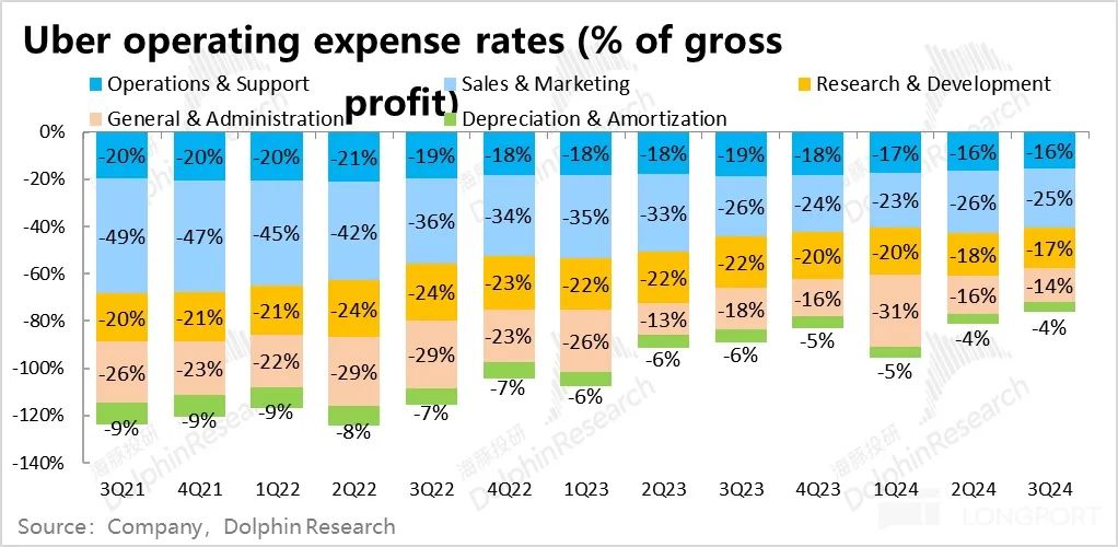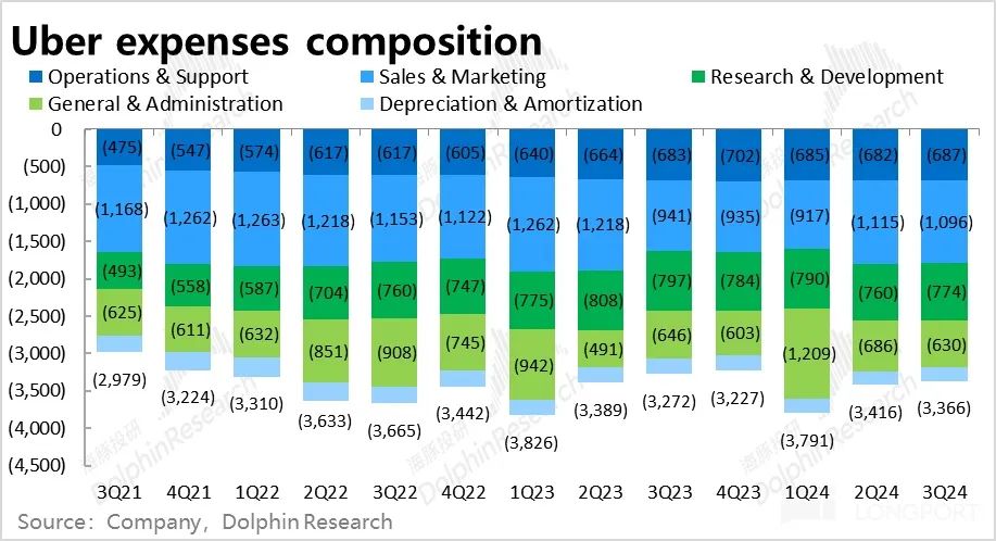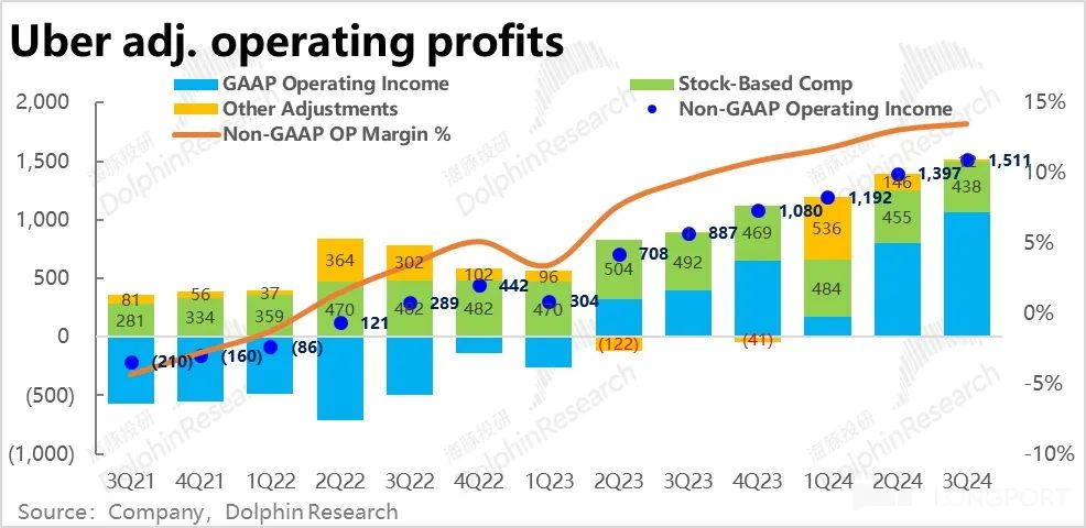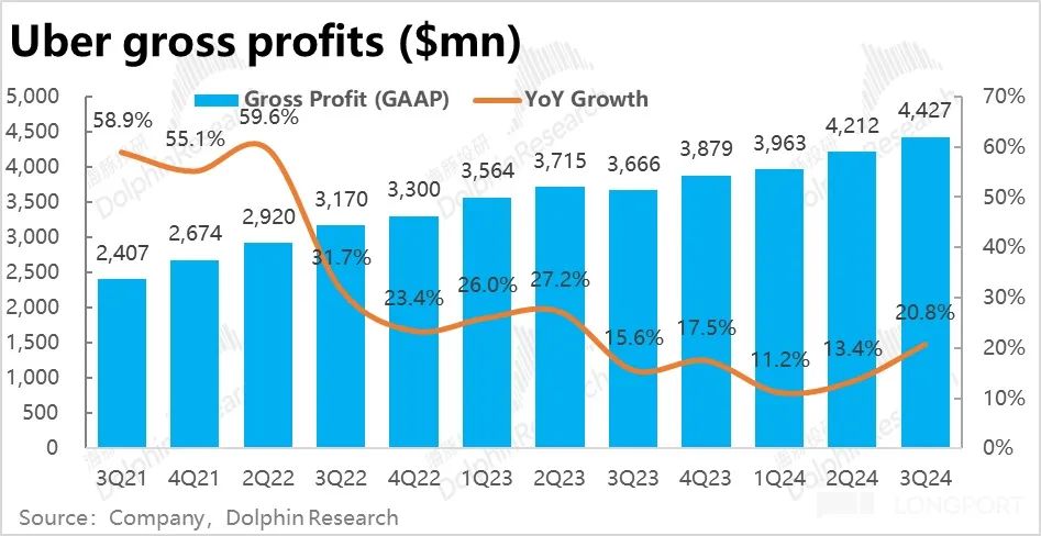 由于企业的收入规格不稳定,不断变化。与不完全相比,毛利/收益比例指标。所以,我们也是主要关注毛利的增长。本季度毛利同比增长 20.8%,与上个赛季相比,大幅加速 7.4pct。 虽然从上面可以看出,本季度收益口径调整正在调整。 GAAP 在规格下夸大了收入的增长率。。但是逻辑上的收益口径调整对毛利没有明显的影响,所以就毛利而言,Uber 调整后变现率的下降并不影响公司自身的收益,即使有压力也会向司机或商家传递。