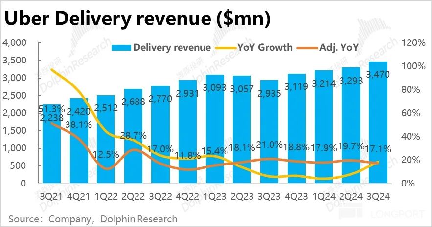 调整后,本季度外卖业务变现率也略有下降。 0.1pct,由于现在 Uber eats 广告变现正在推广,但变现率却比上年略有下降。所以,调整之后,收入增长率也略有放缓。 2.6pct,幸好幅度不大。