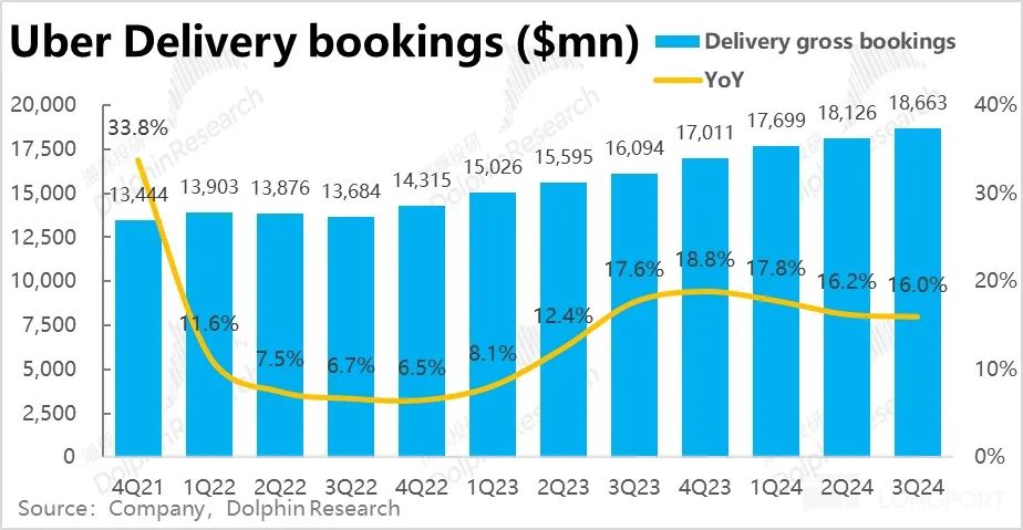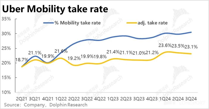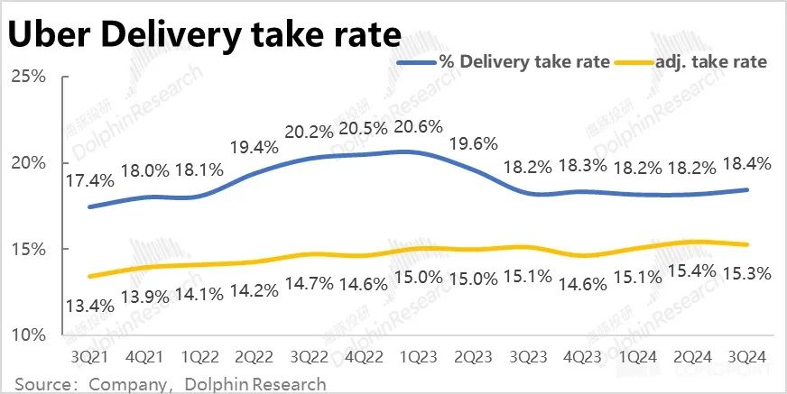 调整后,本季度外卖业务变现率也略有下降。 0.1pct,有点出乎意料的是海豚投研。照理目前 Uber eats 随着广告业务的发展,变现率应该有持续上升的趋势。所以收入增长率也略有放缓。 2.6pct,但在可接受的范围内还是可以接受的。。