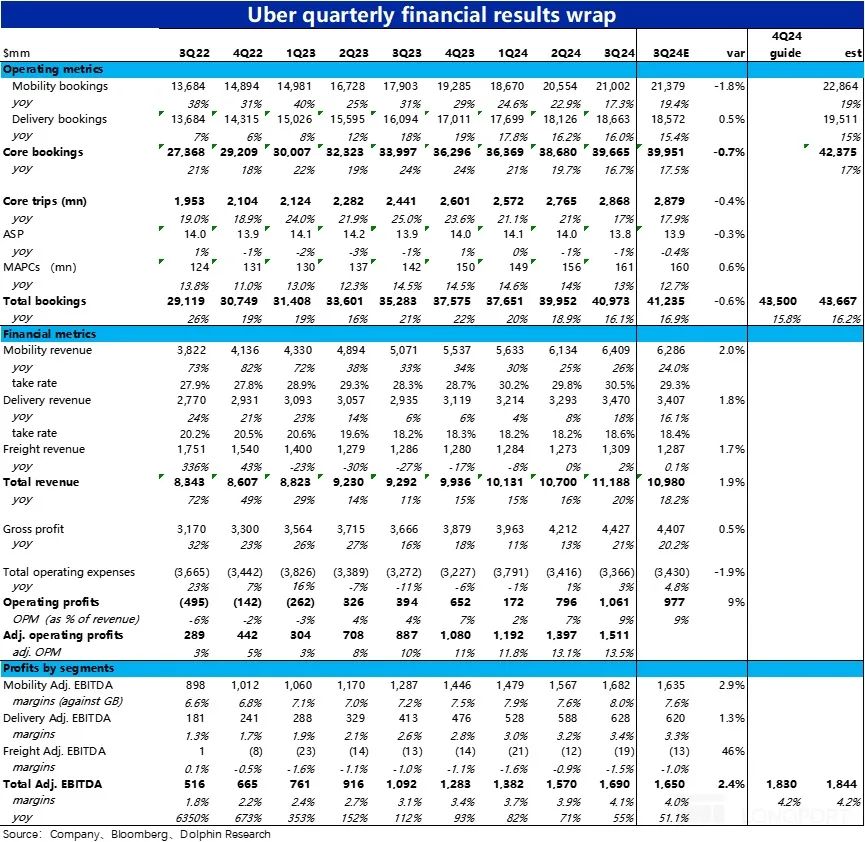 10 月 31 日晚美股盘前,“海外版滴滴”$优步.US 公布了 2024 年三 季度财报。业绩公布后,公司股价大幅下跌 10%,第一眼看到的主要问题是核心出租车业务订单增速放缓,海豚投资研究之前。 first take 中间已经有了初步的解释。本次详细评估,我们将进一步挖掘是否有 还有 其它缺陷,详细要点如下: