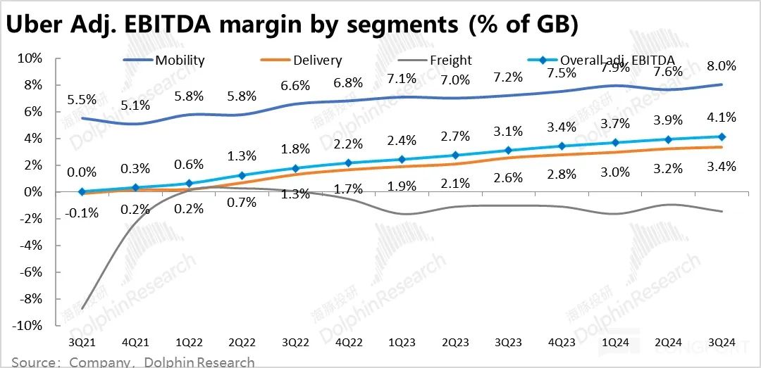 1)打车业务的 adj.EBITDA为 16.8 亿美金,比预期高近 0.5 亿,但尽管调整后 take rate 下降了,但是利润占了 Gross booking 这一比例仍在逐月增加 0.4pct 到 8%。